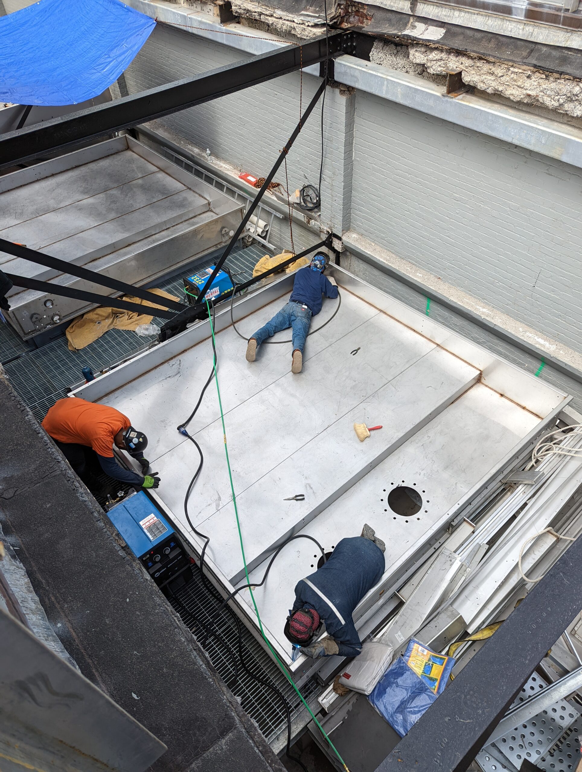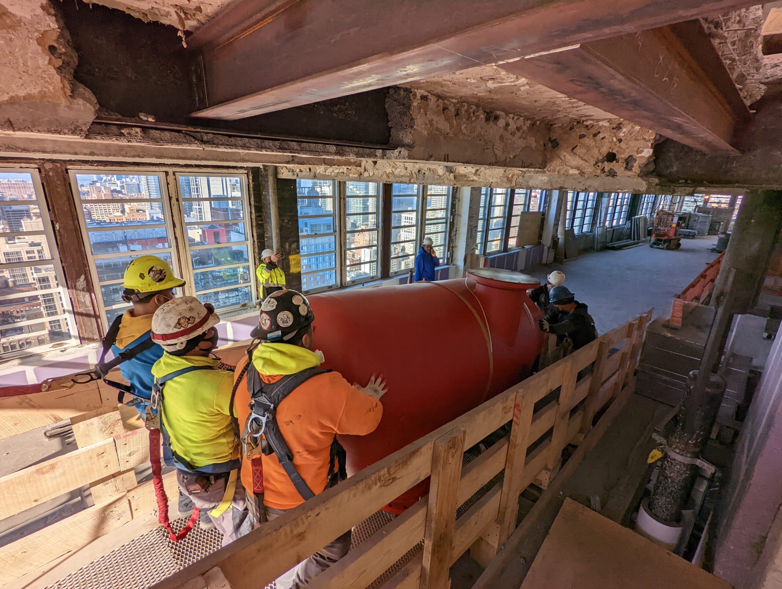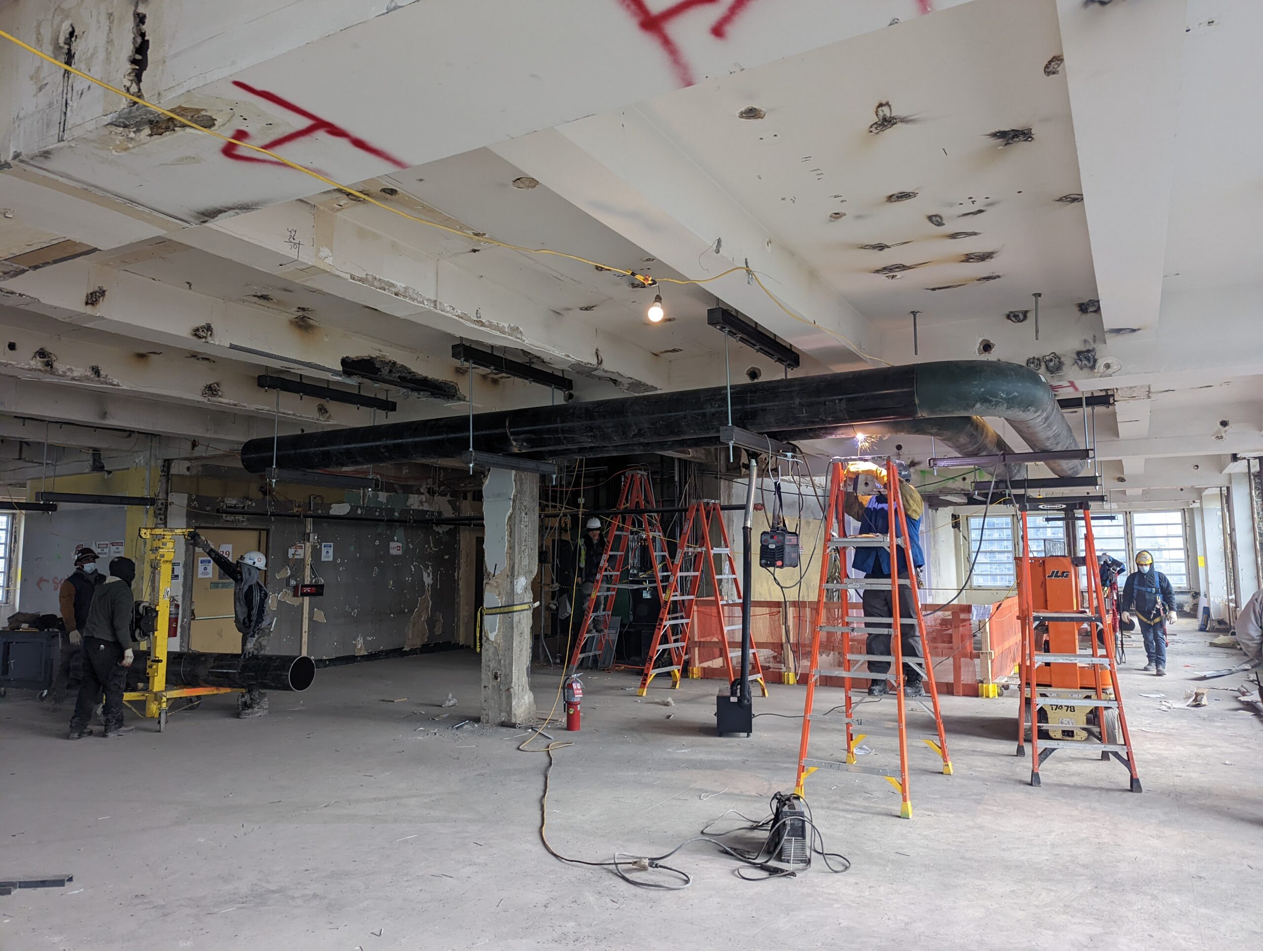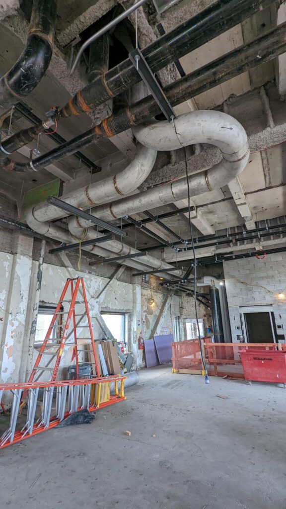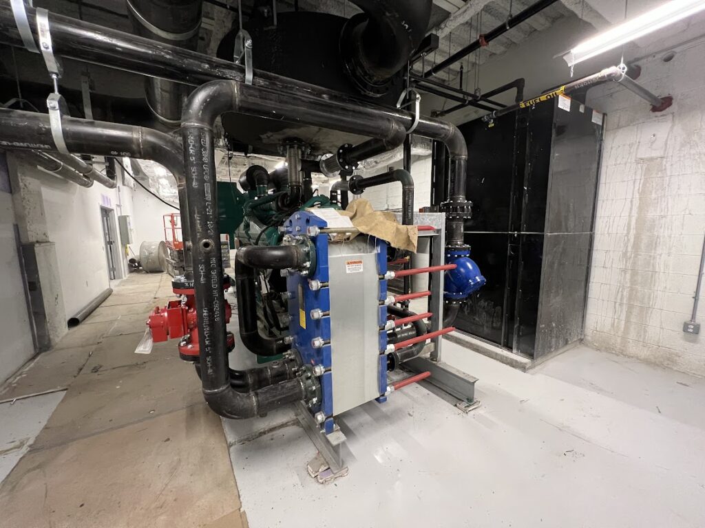 A fuel oil system was also installed with a 5000 gallon fuel oil tank for the generator located in the basement. A 100 ton ERU was built and assembled in the basement for future fit outs on the basement, 1st and 2nd floor. Daikin water cooled VRF was installed for back of house spaces and three 5760 MBH condensing boilers were installed on the